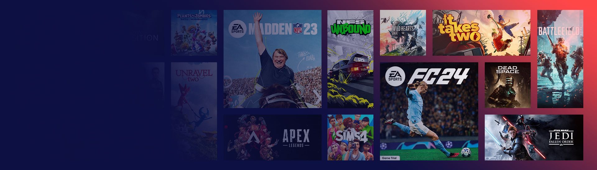 "No matter what kind of PC video game you're looking for – EA's got it! Drop into an epic" battle royale where legendary competitors battle for glory, fame, and fortune on the fringes of the Frontier in Apex Legends™. Experience the action and realism of football when you hit the pitch in the FIFA series. Or unleash your imagination and create a world that’s wholly unique in The Sims 4. "There are tons more titles to choose from in every popular genre, from"shooters "to" racing games "and" RPGs .